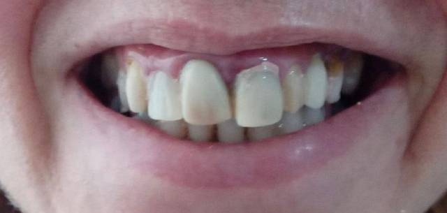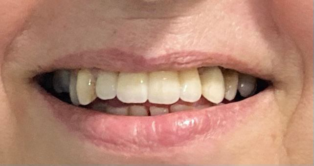 A paciente compareceu à consulta com periodontite (perda óssea) e por consequência mobilidade nos dentes anteriores. A paciente referia não gostar do seu sorriso. Para resolver os problemas apresentados foi feita extração dos 4 incisivos, colocação de 2 implantes e reabilitação anterior com ponte em cerâmica. Desta forma conseguirmos recuperar a funcionalidade dentária e melhorar a auto-estima da paciente.
